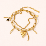 This bracelet features bold elongated links paired with a fine inner chain, creating a modern double-layer effect. The polished gold finish gives it a luxurious glow, while the mix of charms — a sculpted heart and a star accent — adds a playful, celestial touch.