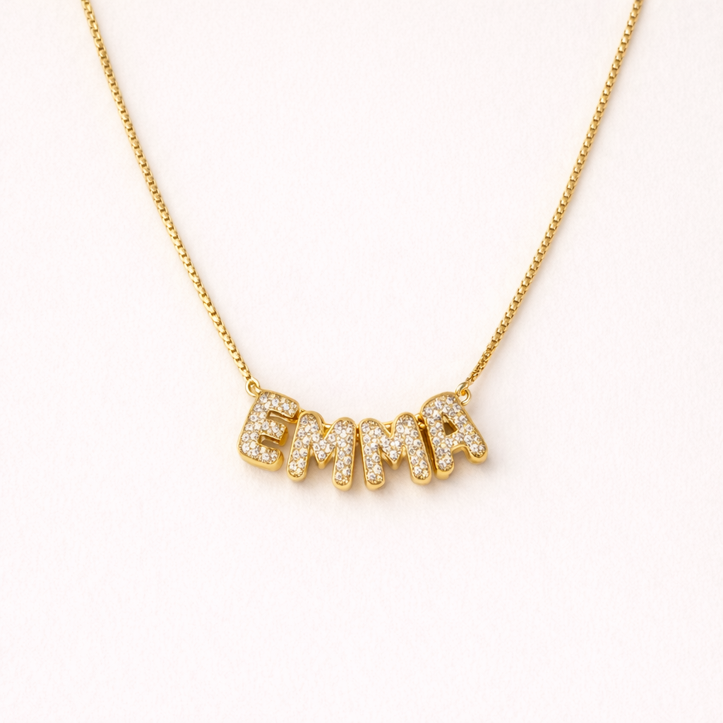 Dale un toque personal a tu estilo con nuestro collar personalizado con letras de burbujas . Elaborado en metal dorado con incrustaciones de piedras brillantes, este collar te permite lucir cualquier nombre, palabra o inicial que signifique para ti.